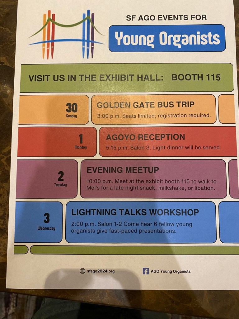The national AGO convention takes place every two years. This year it was located in San Francisco and I was lucky enough to be able to attend along with my father. Since there are so many attendees, workshops are very easy to attend and run almost all the time. In addition, there are recitals every day featuring organists such as James Kealey, Anette Richards, and Nicole Keller. All these events and people made for an amazing time, and to give you a taste, I will walk you through a day at the AGO 2024 National Convention.